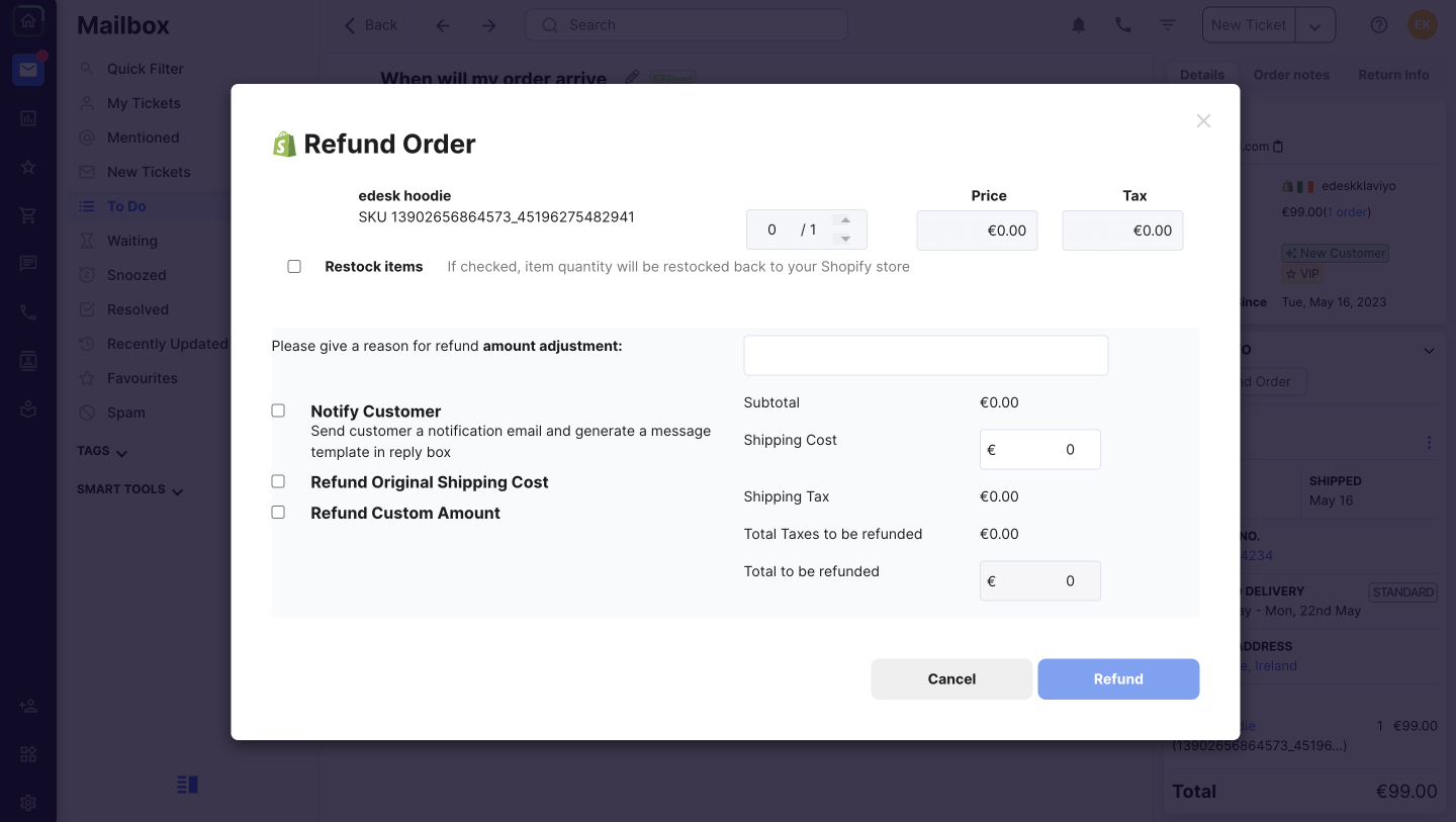 - Gestisci i resi di Shopify, le cancellazioni e crea anche ordini duplicati di Shopify per sostituzioni di articoli, direttamente all’interno del tuo ticket di eDesk